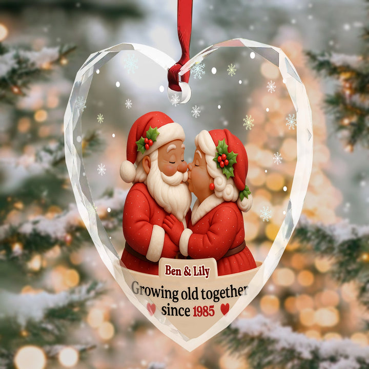 Growing Old Together With Santa Claus And Mrs. Claus, Personalized Heart Glass Ornament , Gift For Couples GLO03020