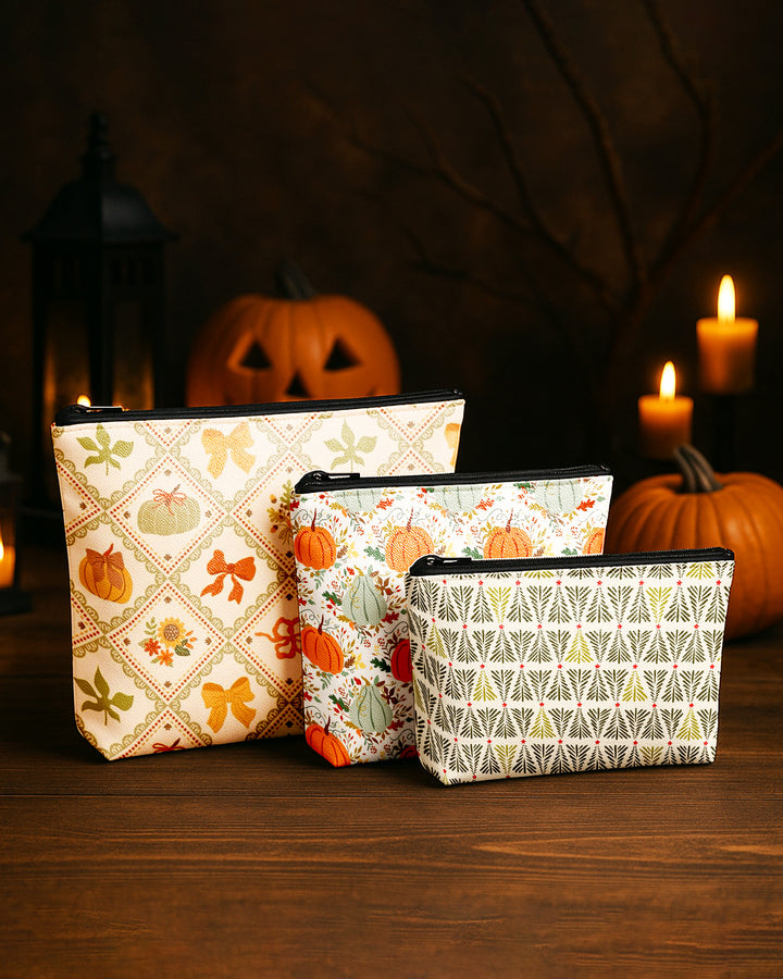Set of 3 - Essential Zipper Pouch for Makeup Bag Pupmkin Pattern - Bow Pumpkin Pattern - Xmas Tree Pattern Cute Christmas GPO0174