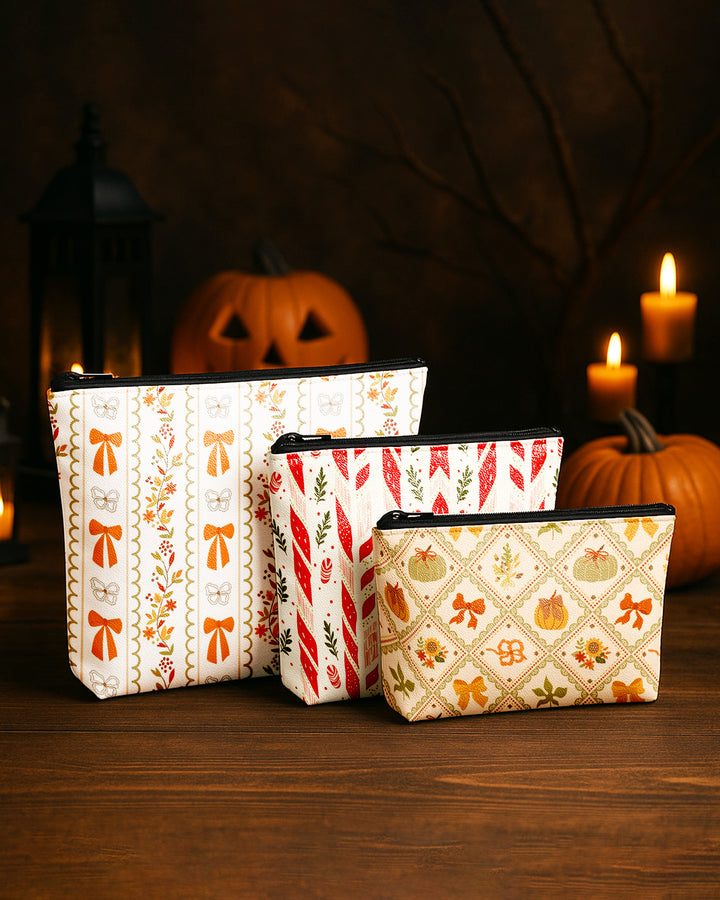 Set of 3 - Essential Zipper Pouch for Makeup Bag Red Xmas Pattern - Bow Pattern - Bowl Pumpkin Pattern Cute Christmas GPO0175