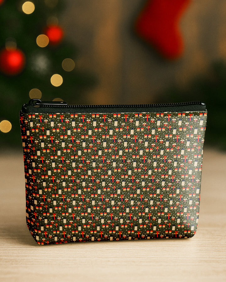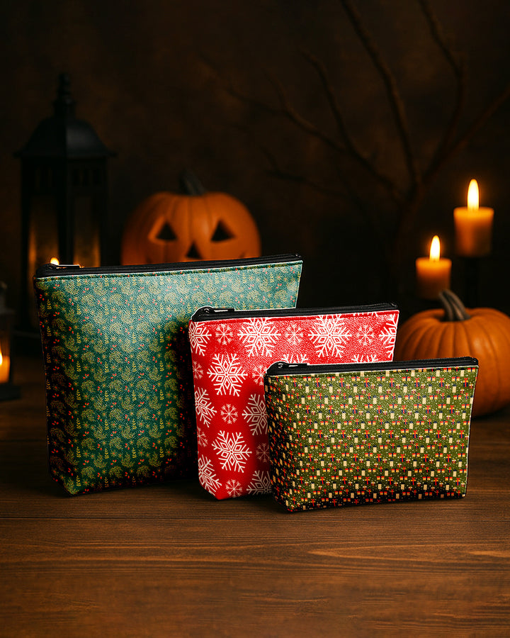 Set of 3 - Essential Zipper Pouch for Makeup Bag Snow Flower Pattern - Gold Leaves Red Berries Green - Gifts Stars Green Background Cute Christmas GPO0193