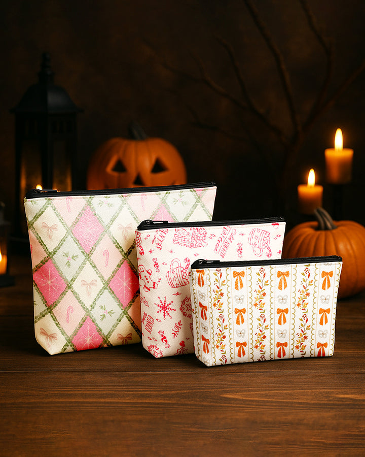 Set of 3 - Essential Zipper Pouch for Makeup Bag Xmas Pattern - Candy Bow Pattern - Bow Pattern Cute Christmas GPO0178