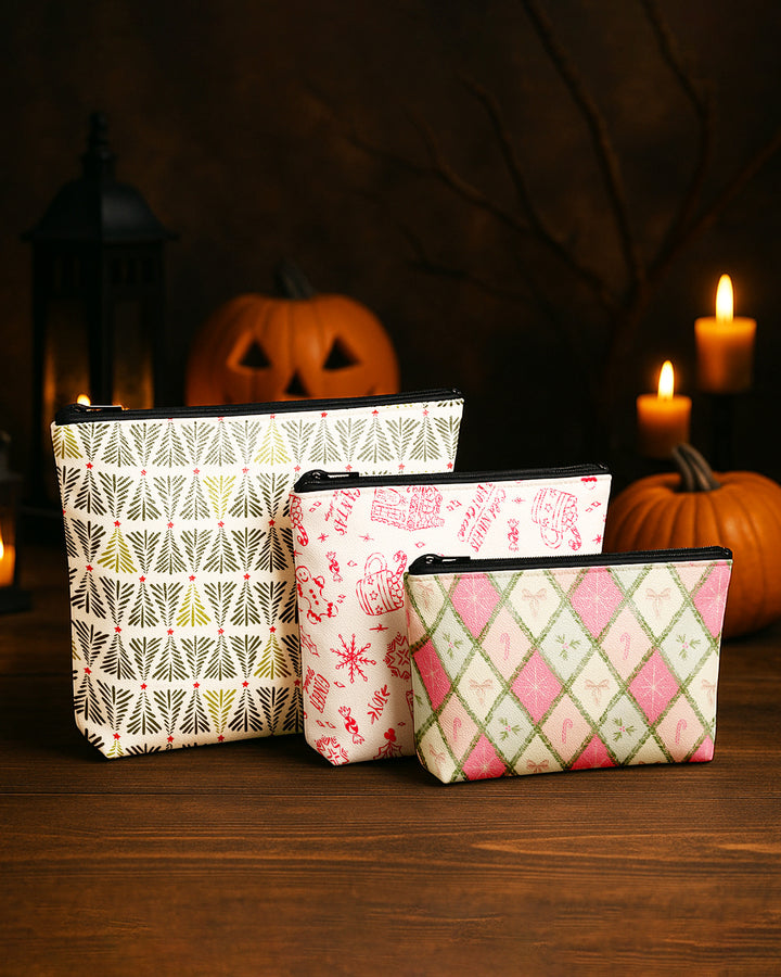 Set of 3 - Essential Zipper Pouch for Makeup Bag Xmas Pattern - Xmas Tree Pattern - Candy Bow Pattern Cute Christmas GPO0180