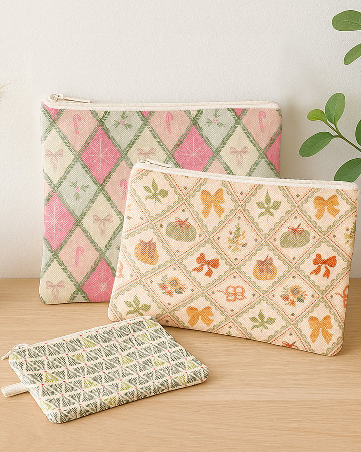 Set of 3 - Flat Zipper Pouch for Makeup Candy Bow Pattern - Bow Pattern - Xmas Pattern Cute Christmas GZP03