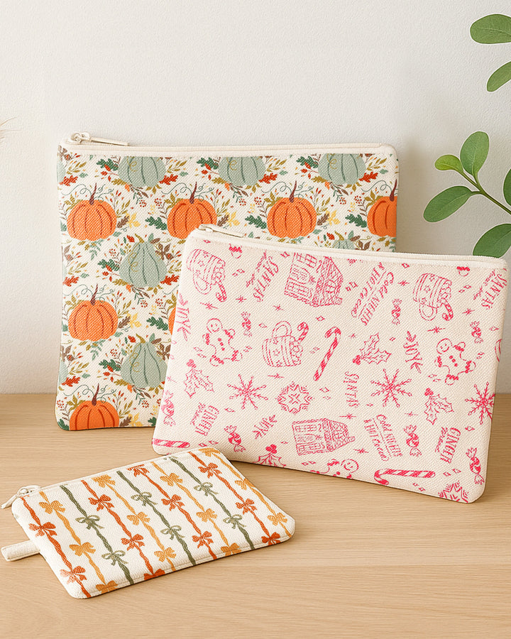 Set of 3 - Flat Zipper Pouch for Makeup Pumpkin Pattern - Xmas Pattern - Colorful Bow Pattern Cute Christmas GZP09