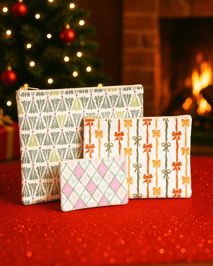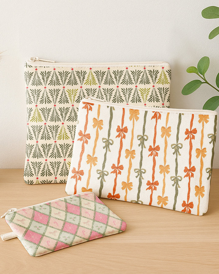 Set of 3 - Flat Zipper Pouch for Makeup Xmas Tree Pattern - Colorful Bow Pattern - Candy Bow Pattern Cute Christmas GZP019