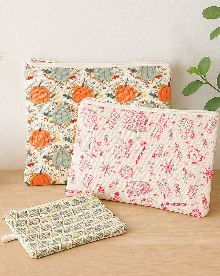 Set of 3 - Flat Zipper Pouch for Makeup Pumpkin Pattern - Xmas Pattern - Xmas Tree Pattern Cute Christmas GZP010