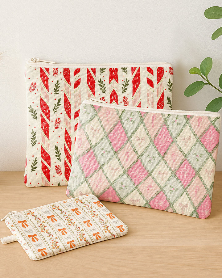 Set of 3 - Flat Zipper Pouch for Makeup Red Xmas Pattern - Candy Bow Pattern - Bow Pattern Cute Christmas GZP012