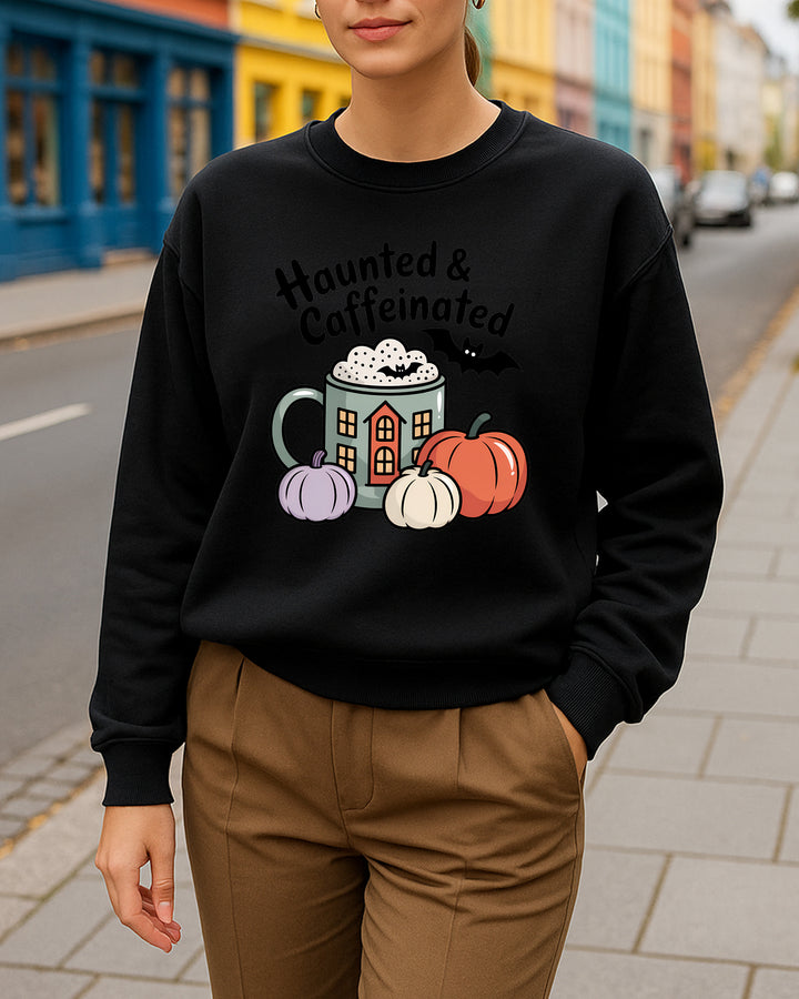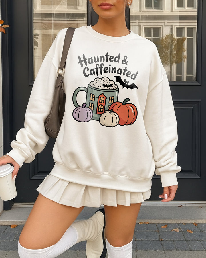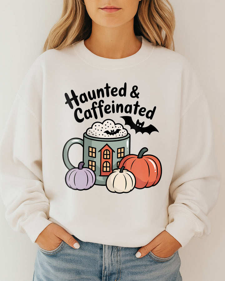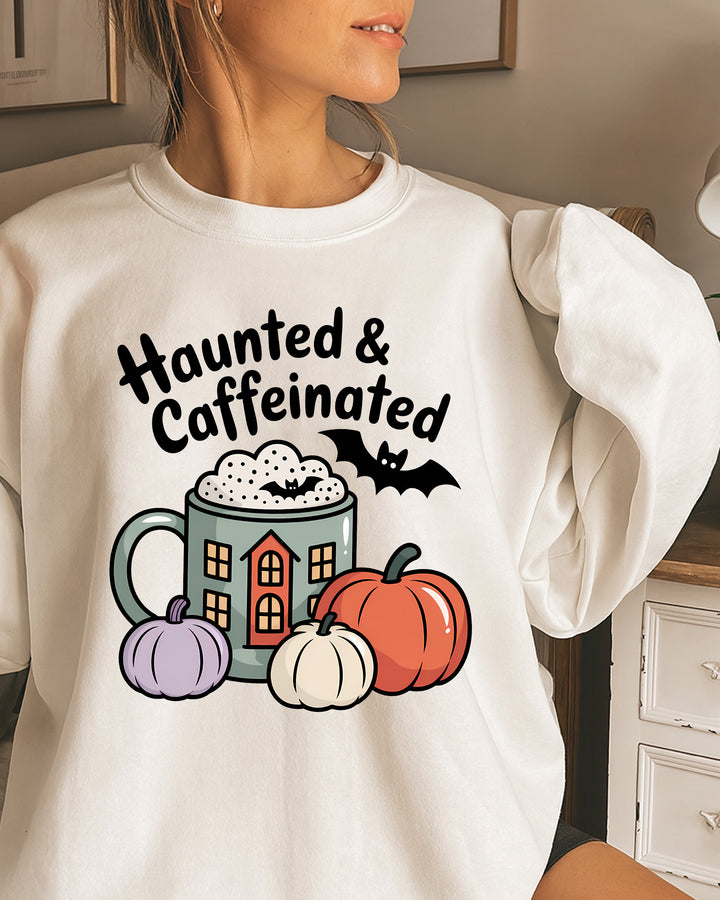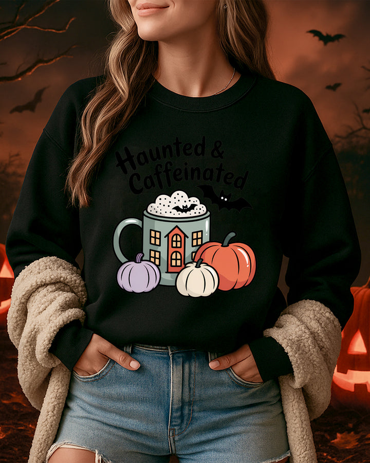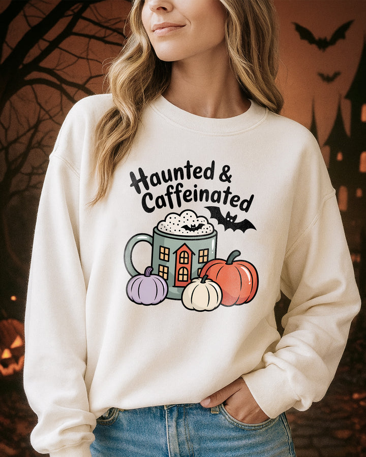 Sweater Haunted & Caffeinated Coffee Cream Cup Bat Cute Halloween GSW058